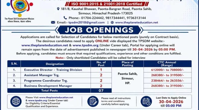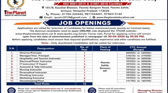 Paonta Sahib: शिक्षा और कौशल विकास (Skill Development) के क्षेत्र में जिला सिरमौर की अग्रणी संस्था द प्लैनेट ग्रुप ऑफ इंस्टीट्यूशंस ने योग्य और अनुभवी उम्मीदवारों के लिए नौकरी के अवसर निकाले हैं।